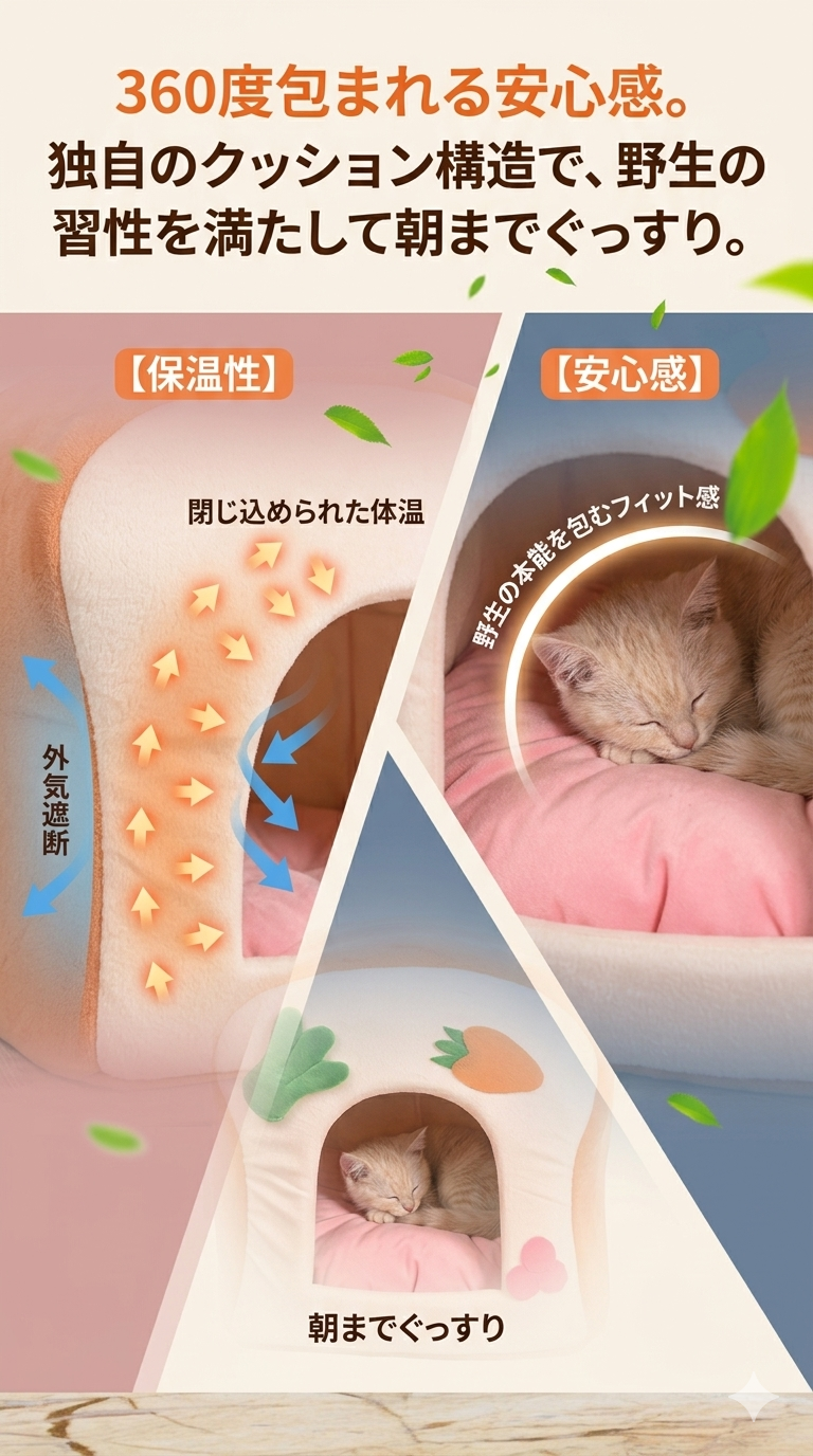 睡眠は、単なる休息ではありません。寝ている間に成長ホルモンが分泌され、免疫力が高まり、その日の記憶が整理されます。不眠が続くと、免疫力の低下やストレスによる食欲不振、さらには攻撃的な性格に繋がることもあります。「しっかり暖かく、外を遮断して眠る」こと。このシンプルな環境を整えてあげることが、愛する我が子と1日でも長く、健やかに過ごすための「心のサプリメント」になるのです。