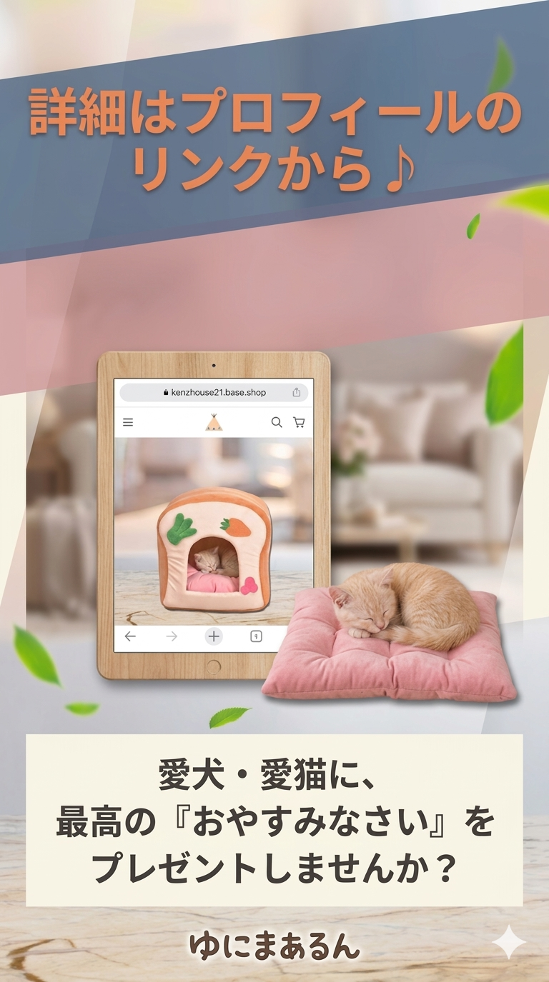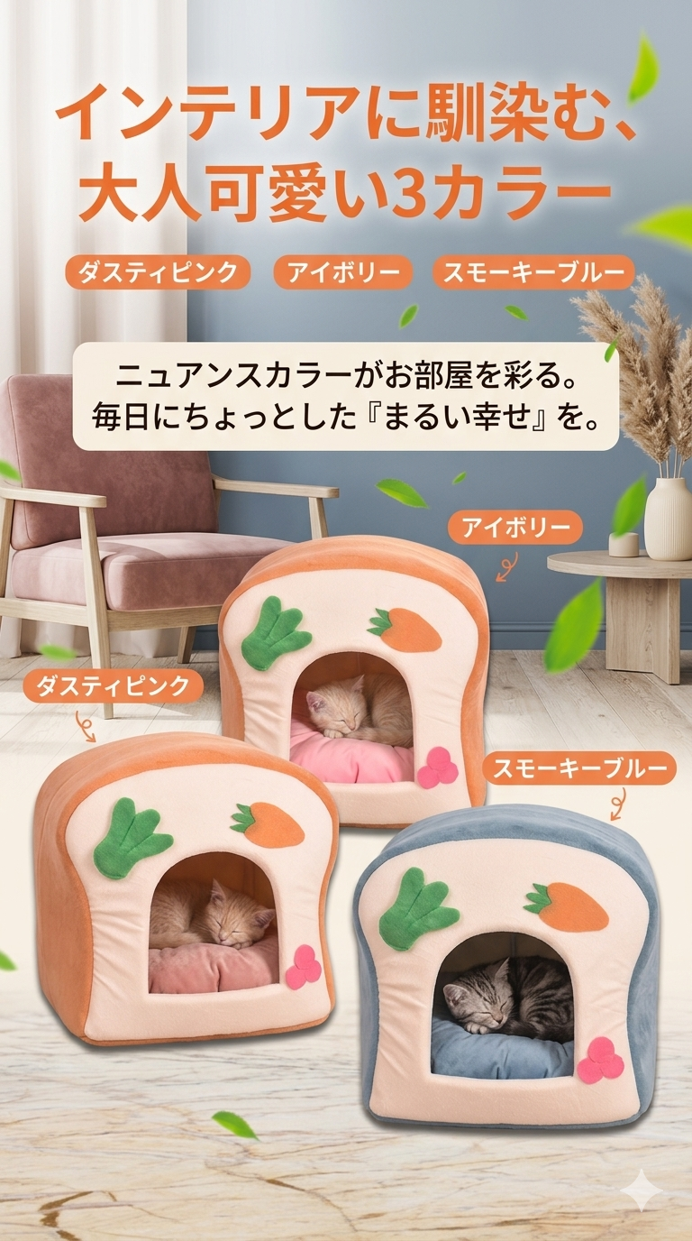 そこでご紹介したいのが、ゆにまあるんの「ペットハウス(トーストハウス)」です。まるで本物の食パンにサンドされているようなこのハウスは、可愛いだけではありません。厚みのあるクッションが床冷えを完全にガードし、すっぽりと体が収まる設計が、ペットに「守られている」という絶対的な安心感を与えます。アイボリー、ダスティピンク、スモーキーブルーの3色は、お部屋のトーンを崩さず、飼い主様の心も優しく彩ります。
