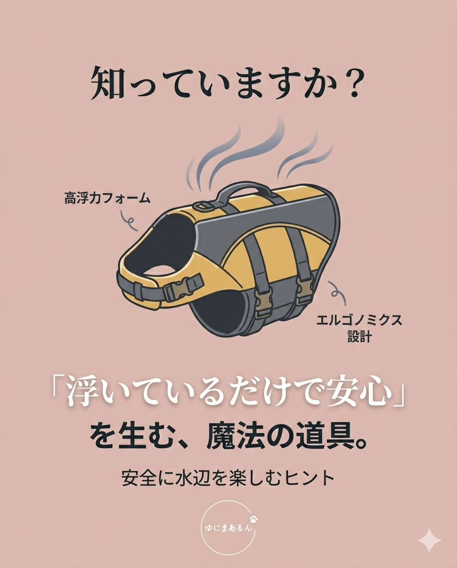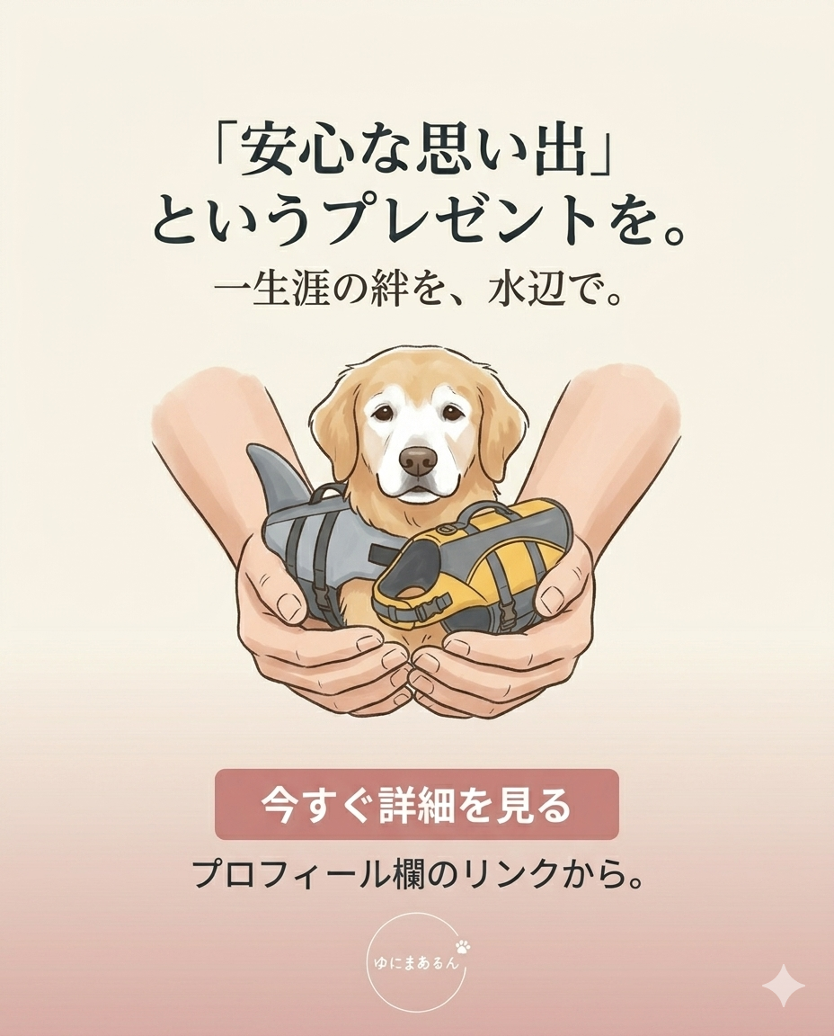 シニア犬にとって、水辺が「不安な場所」に変わってしまうのには理由があります。一つは、筋力の低下により踏ん張りが効かなくなること。そしてもう一つは、浮力の助けがない状態では自力で姿勢を保つのが難しく、パニックを起こしやすいことです。飼い主様が「もし何かあったら…」と不安を感じるその緊張は、敏感なわんちゃんにも伝わってしまいます。この「見えない不安」こそが、楽しいはずのお出かけを遠ざけてしまう大きな原因なのです。